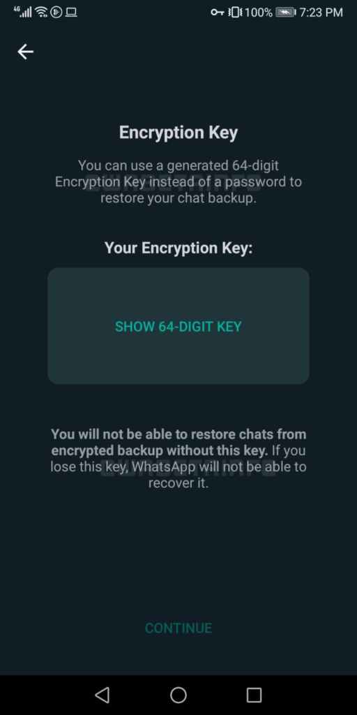 Además, las copias de seguridad seguras también admiten una clave de cifrado de 64 dígitos que se puede utilizar para restaurar su contraseña. Sin embargo, si pierde la clave, no podrá restaurar su historial de chat.