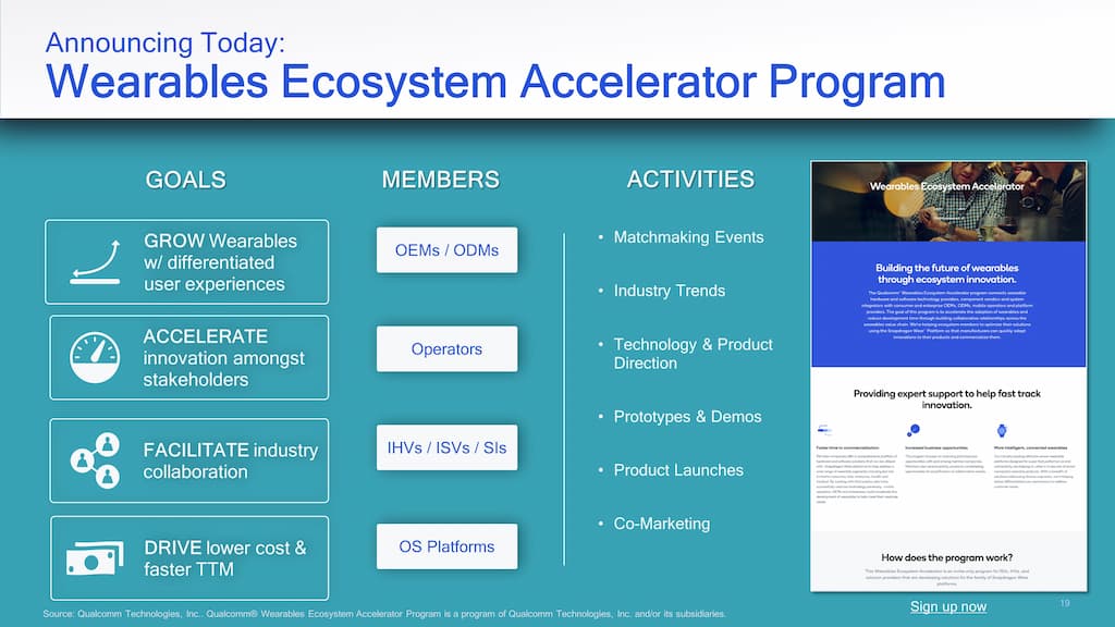 El segmento de los dispositivos portátiles es muy prometedor, pero también presenta enormes desafíos a abordar en la industria. Para facilitar la colaboración entre las empresas y acelerar las soluciones a estos desafíos, Qualcomm Technologies lanzó el Programa Acelerador de Ecosistemas de Qualcomm Wearables, que está compuesto por fabricantes de dispositivos (ODM), proveedores de servicios, reproductores de plataforma, proveedores independientes de hardware y software (IHV e ISV) y sistemas integradores y trabajará junto con los OEM para desarrollar y comercializar más fácilmente productos y soluciones.