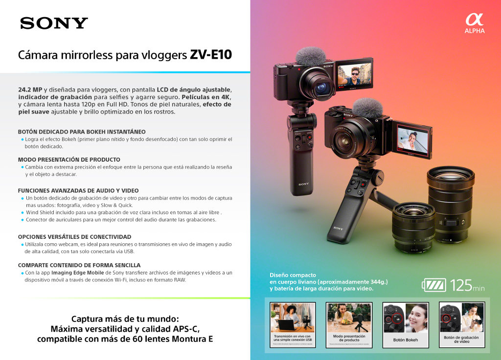 “Con la presentación de la ZV-E10, la primera cámara para vloggers de lente intercambiable de Sony, confirmamos nuestro interés continuo en escuchar la voz del consumidor y también en ofrecer un producto que se adapte a sus gustos y necesidades” comentó Angelo Marconi, gerente de categoría de Digital Imaging de Sony Latin. “La nueva ZV-E10 enfocada a la creación de video, garantiza una máxima versatilidad y calidad al ser compatible con los más de 60 lentes de Montura-E compatibles, también incluye funciones básicas para cualquier YouTuber. Lo anterior la convierte en una herramienta ideal para los vloggers que están buscando una transición hacia una configuración de estudio o outdoors más avanzada”, agregó.