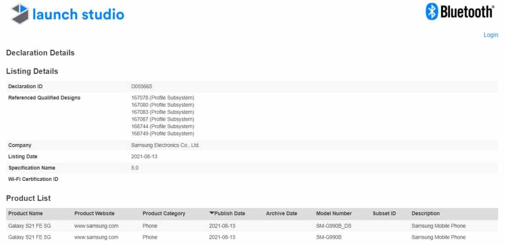Con lo cual el Samsung Galaxy S21 FE 5G recibió el visto bueno de la autoridad SIG de Bluetooth. La certificación cubre los números de modelo SM-G990N, SM-G990B y SM-G990B_SD, todos los cuales son compatibles con Bluetooth 5.0.