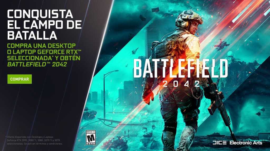 NVIDIA anunció hoy, en el marco de la Gamescom 2021, un bundle con el juego Battlefield 2042 gracias al cual, por tiempo limitado, los jugadores recibirán una copia descargable en PC al comprar una, laptop o desktop, equipada con las unidades gráficas de procesamiento (GPU) GeForce RTX 3070, RTX 3070 TI, RTX 3080, RTX 3080 TI y RTX 3090.