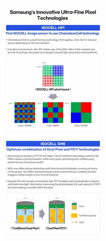 Samsung anunció un nuevo sensor de imagen ISOCELL HP1 de 200 megapíxeles, que según la compañía es el primero para dispositivos móviles. El sensor de imagen cuenta con 200 millones de píxeles de 0,64 μm y el silicio ya es lo suficientemente pequeño como para caber en hardware móvil (Fuente Samsung).