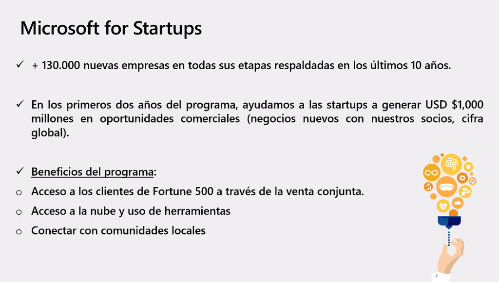 Microsoft for Startups es un programa destinado a ayudar a las startups a acelerar su crecimiento al darles acceso a clientes, tecnología, soporte y comunidades técnicas. Después de escuchar las necesidades de la comunidad emprendedora el programa se enfoca en tres pilares: