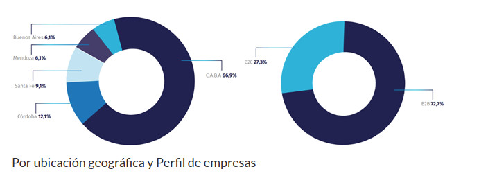 A nivel geográfico, el 66,9% de las startups invertidas se ubica en CABA, el 12,1% en Córdoba, el 6,1% en Santa Fe, el 6,1% en Mendoza y el 6,1 % en la Provincia de Buenos Aires. Sobre el total de las empresas, un 72,7% ofrecen productos o servicios B2B y el 27,3% B2C.