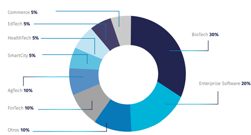 Los principales verticales invertidas en este segmento son: biotecnología (30%), software (20%) y Fintech/Agtech/Otros (10%).