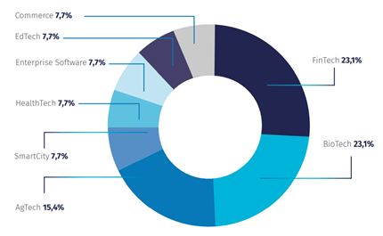 Los principales verticales invertidas en este segmento son: BioTech y FinTech (23,1%), AgTech (15,4%) y Commerce, EdTech, Software, HealthTech y SmartCity (7,7%).