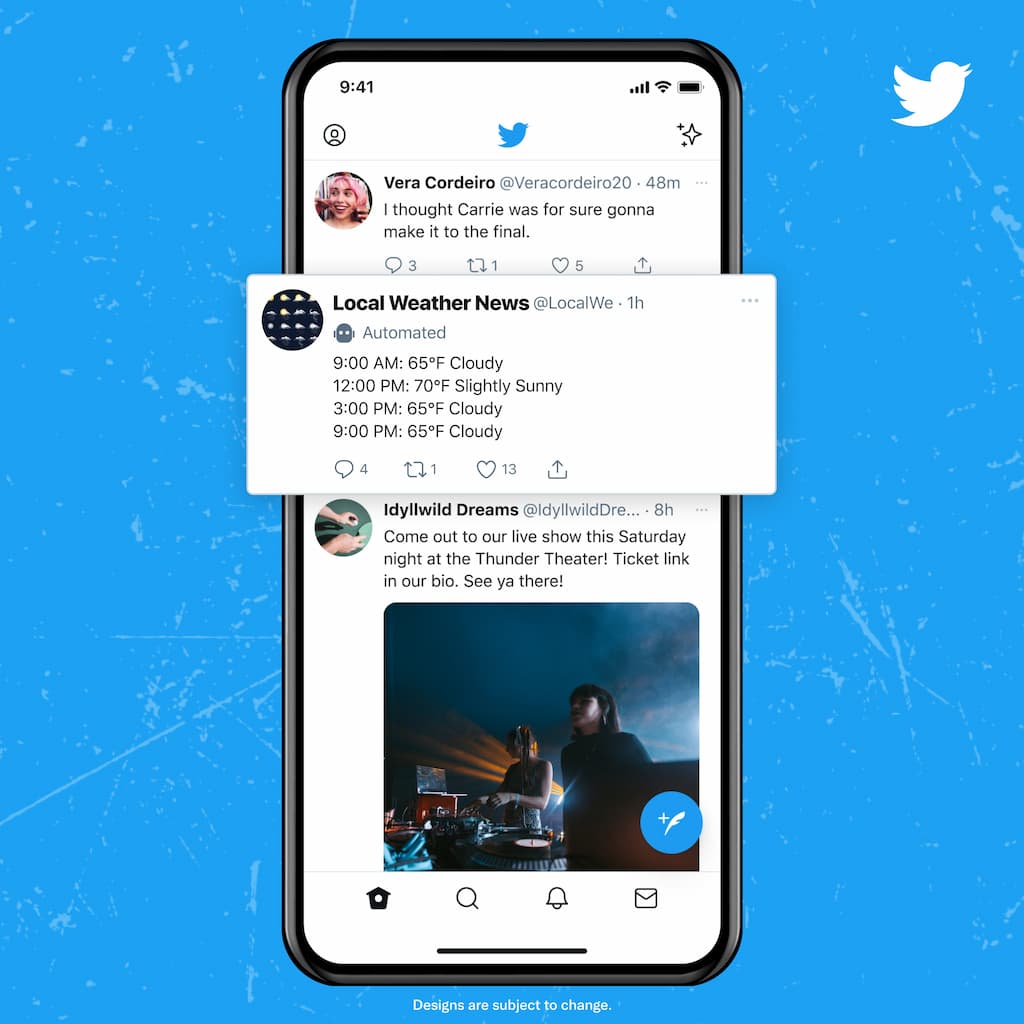 Twitter afirma que la función se ha implementado para seleccionar cuentas de desarrollador, lo que permite aplicar etiquetas para indicar si un tweet ha sido automatizado por un «buen bot» o no. Las etiquetas incluyen una imagen de cabecera de robot y las palabras «Automatizado por» o simplemente «Automatizado».