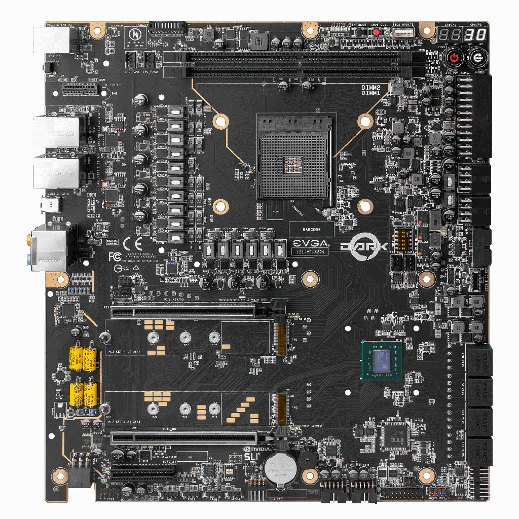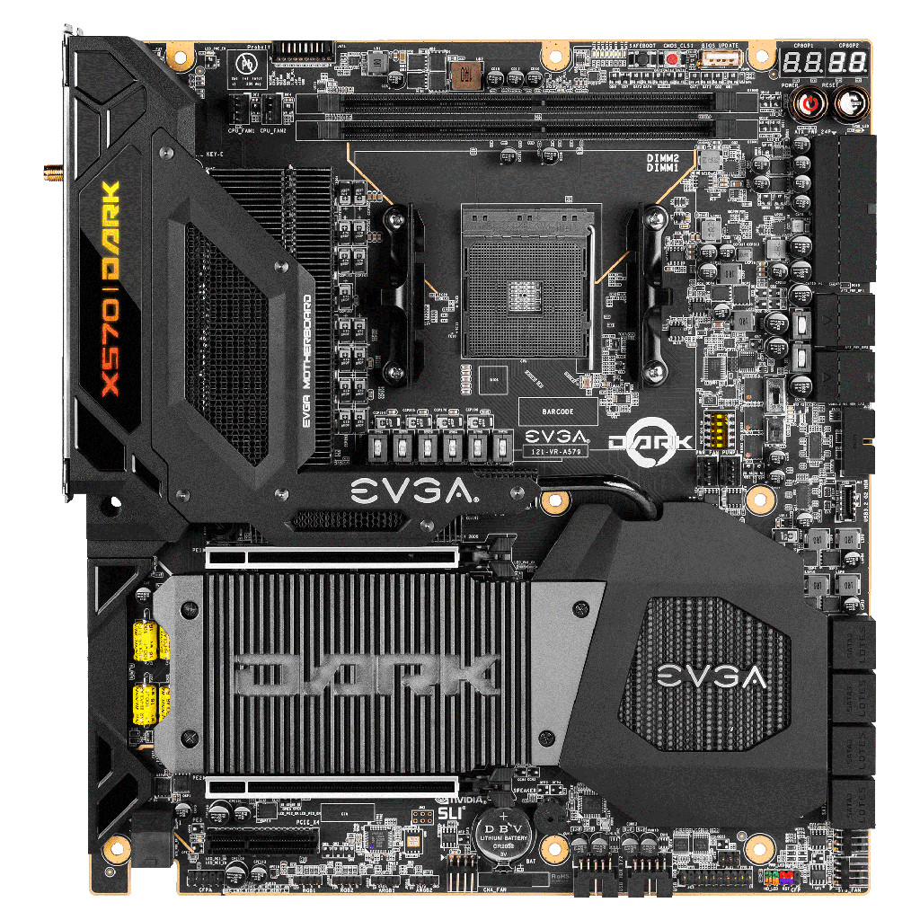 La EVGA X570 DARK sigue los pasos de los modelos anteriores de la línea DARK y cuenta con sus características tradicionales como un zócalo rotado a 90° para una mejor disposición del VRM, conectores de alimentación a 90° para mejor manejo de cables, y una gran cantidad de características para overclocking que incluyen múltiples indicadores POST, un conector ProbeIt para medición de voltaje en tiempo real, switches para deshabilitar puertos PCIe y para activar el modo lento, y doble BIOS para almacenar múltiples configuraciones y asegurar que el sistema funcione aún bajo las máximas exigencias.