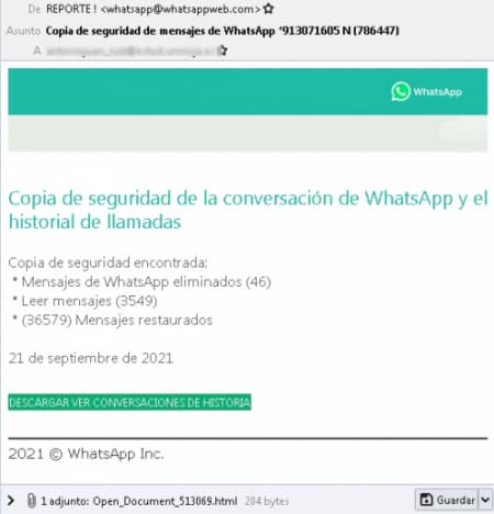 Pie de imagen: La Oficina de Seguridad del Internauta de España (OSI) y la Guardia Civil alertaron acerca de una campaña de phishing en la cual se intenta suplantar la identidad de WhatsApp: Correo que ha estado circulando e incluye un archivo HTML adjunto. Fuente: OSI.