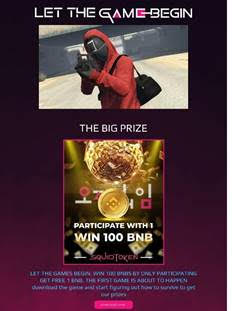 Además de las «clásicas» páginas de phishing, que ofrecen transmitir El Juego del Calamar, también se encontraron varias páginas que ofrecen competir en una versión en línea del juego para ganar el premio principal: 100 BNB (moneda de una plataforma de intercambio de criptomonedas). No hace falta decir que el jugador nunca recibe la recompensa prometida y acaba perdiendo sus datos o descargando malware.