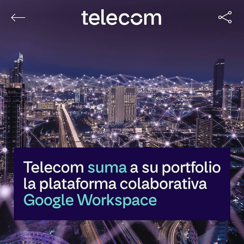 Telecom, suma a su portfolio la plataforma de transformación cultural y colaborativa, Google Workspace, que incluye un paquete de aplicaciones y herramientas de productividad nativo de la nube potenciado por inteligencia artificial. Esta incorporación ayudará a las pymes y grandes empresas a optimizar los flujos de trabajo, reducir los tiempos que dedican a la administración de sus tareas y mejorar la productividad de todos los equipos (Fuente Telecom Argentina).