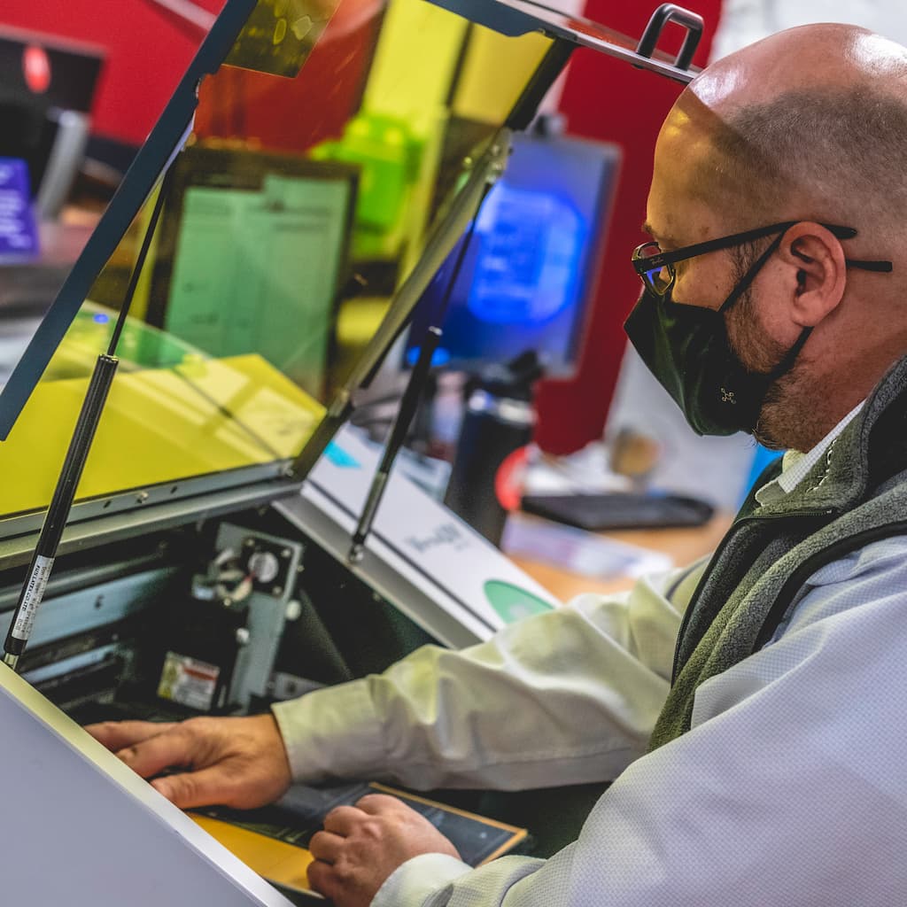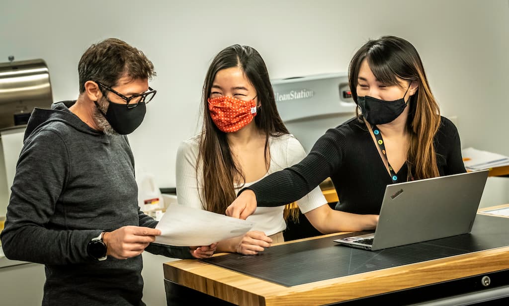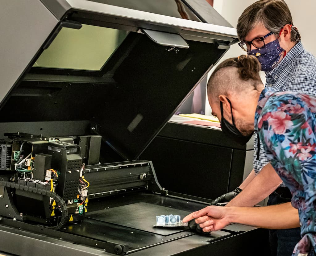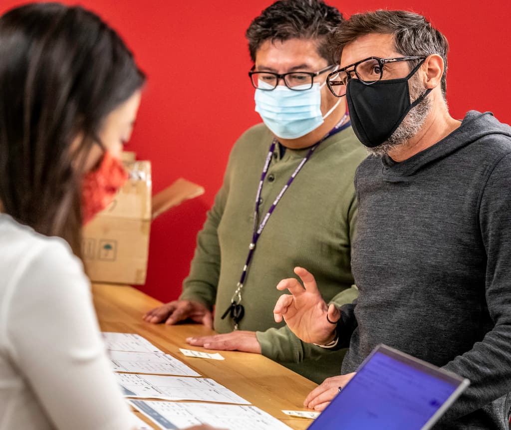 De izquierda a derecha: Los empleados de Motorola 312 Lab revisan un componente impreso 3D en la HQ Model Shop y analizan propuestas durante una sesión de ideas de Motorola 312 Lab.