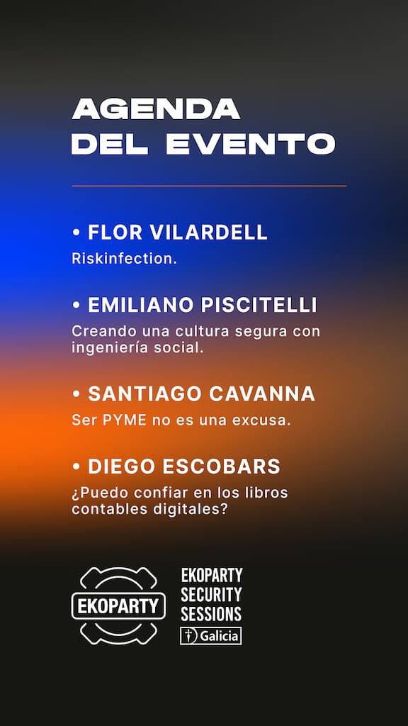 Galicia junto a Ekoparty, la conferencia de seguridad informática más grande de América Latina, realizarán una nueva edición de las Security Sessions Vol.III, una serie charlas abiertas para la comunidad cuyo diferencial es un mensaje motivacional, técnico, informativo y específico en 30 minutos aproximadamente (Fuente Galicia y Ekoparty).