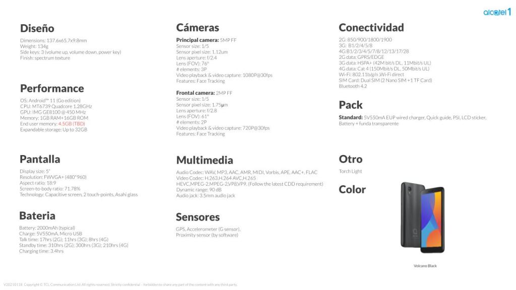 El nuevo equipo posee una cámara principal de 5MP, cámara frontal de 2 MP y memoria de 1GB + 16 GB. Además, cuenta con una batería de 2000 mAh, pantalla de 5’’, 18:9 y bisel curvo para un agarre cómodo, Android 11 (Go edition) y procesador Quad Core.