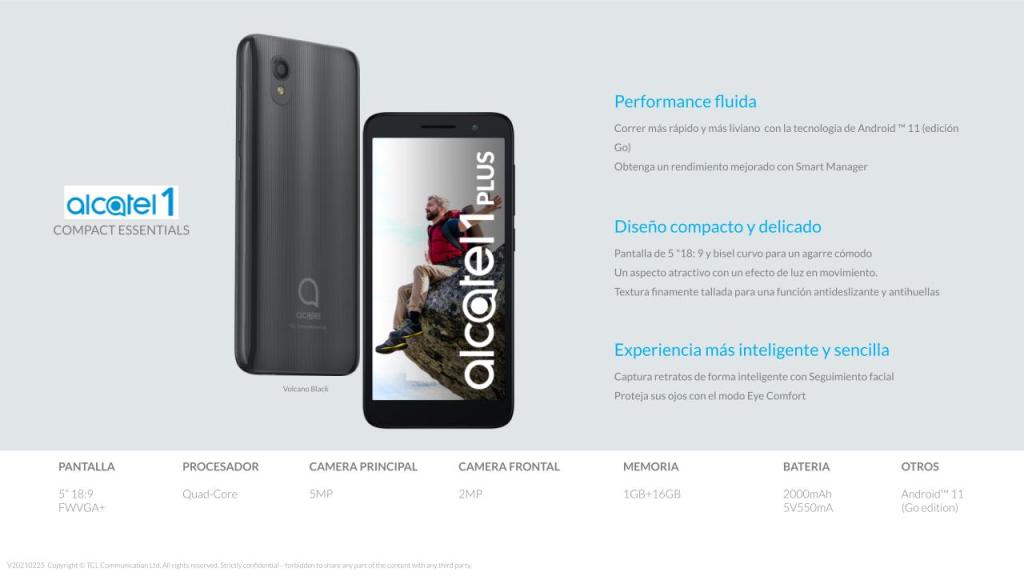 Alcatel lanza al mercado el 1 Plus, un equipo de performance fluida, buen rendimiento y un diseño compacto y delicado que apunta a la gama de entrada. La marca se caracteriza por brindar equipos con una tecnología progresiva al alcance de todos, brindando apoyo en el rápido ritmo de la vida moderna (Fuente Alcatel Argentina).