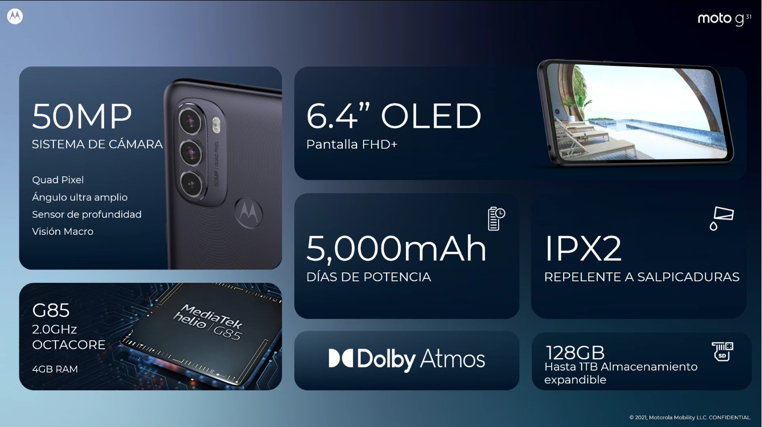 El moto g31 incluye una pantalla Full HD+ Max Vision de 6,4” con más de 400 ppp para obtener detalles más nítidos y tecnología OLED para lograr colores más realistas. El sistema multicámara de 50MP12 permite capturar los mejores recuerdos con un nivel de detalle increíble. Y con él, será posible pasar hasta 36 horas con una sola carga.