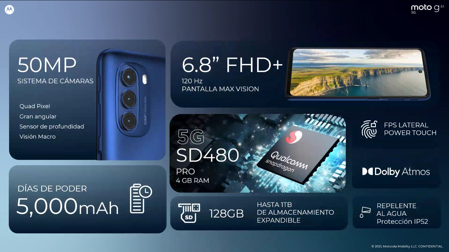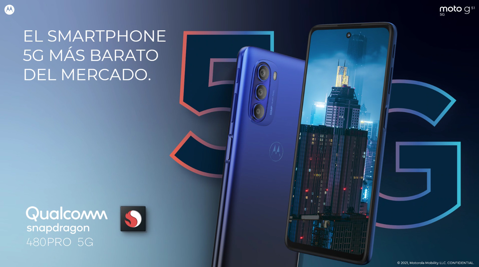 El moto g51 5G es uno de los smartphones 5G más baratos del mercado. Cuenta con una pantalla ultra ancha de 6,8 pulgadas con resolución Full HD+ con colores brillantes y nítidos. La experiencia mejora aún más con una frecuencia de actualización de 120Hz súper fluida. El sistema de triple cámara con sensor principal de 50MP está listo para capturar cualquier escena en un instante, ya sea un detalle pequeño o un paisaje grande. Y para hacer todo esto posible, la plataforma móvil Snapdragon® 480 Plus, los 128 GB de almacenamiento interno y 4 GB de RAM lo potencian todo para una experiencia perfecta, más rápida que sus predecesores.