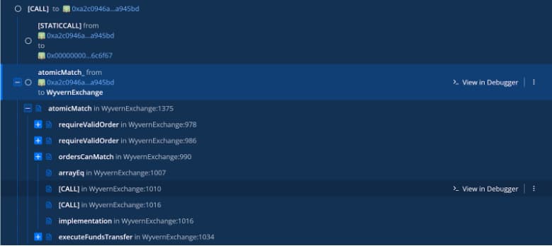 - El contrato OpenSea se comunica con los contratos NFT y transfiere el NFT de la víctima al atacante según los parámetros atomicMatch.