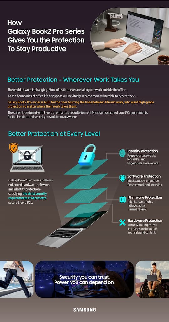 A medida que más estudiantes y profesionales disfrutan de entornos laborales remotos o híbridos, la protección de sus datos, identidad y privacidad sigue siendo una prioridad para Samsung. Para proteger aún más a los usuarios, la serie Galaxy Book2 Pro es la primera línea de PC de consumo que cumple con los requisitos de PC de núcleo seguro de Microsoft. Diseñada anteriormente para PC empresariales en industrias de alta seguridad como finanzas, atención médica y gobierno, secure-core PC designación de la serie Galaxy Book2 Pro ofrece un nivel perfeccionado de protección en Windows 11 y cuenta con hardware, firmware y software profundamente integrados para aumentar la protección contra posibles ciberataques. Ahora, todos pueden disfrutar de seguridad avanzada para una mayor tranquilidad.