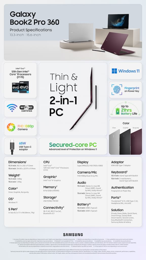 “Seguimos ampliando los límites de lo que es posible en nuestra asociación de larga data con Samsung a través de mayores recursos, una mayor integración de la plataforma y más optimización utilizando nuestros nuevos procesadores Intel® Core™ de 12ª generación”, dijo Jim Johnson, Vicepresidente Sénior y Gerente General Interino del Grupo de Computación del Cliente en Intel Corporation. “Con la serie Galaxy Book2 Pro, los resultados hablan por sí solos. Estas son algunas de las PC más livianas, delgadas y poderosas en las que hemos tenido la oportunidad de trabajar”.