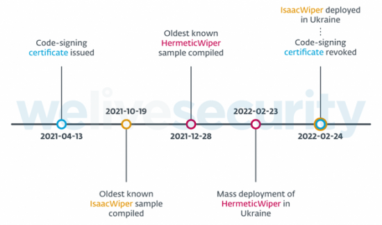 - El 23 de febrero de 2022, una campaña con fines destructivos utilizó HermeticWiper y apunto contra varias organizaciones ucranianas.
