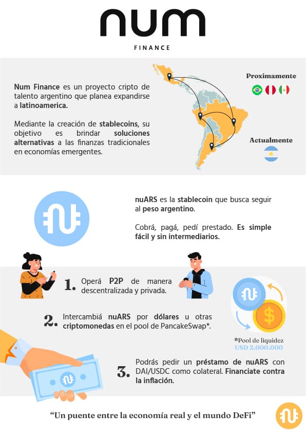 La criptomoneda nuARS son parte de la iniciativa de Num Finance, un proyecto desarrollado 100% por talento argentino. El objetivo es crear criptomonedas estables para los países emergentes siguiendo el valor de las monedas locales, ofreciendo así una red cripto multilatina y facilitando a que nuevas personas ingresen a este ecosistema.