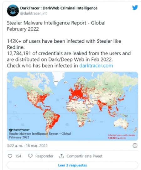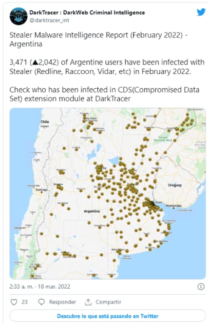 Este tipo de código maliciosos, conocido en inglés como Infostealer malware, suele ser distribuido en mercados clandestinos de la dark web por poco dinero para que otros actores maliciosos lo utilicen en sus campañas. Solo en Argentina se detectaron 3471 nuevos usuarios infectados con este tipo de malware en febrero de 2022, lo que representa un aumento de más de 2.000 usuarios con respecto a enero. En Brasil fueron 13.598 el número de usuarios afectados en febrero, lo que significa 2.560 víctimas más que el mes anterior.