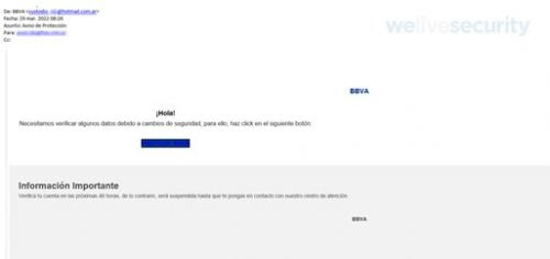 ESET, compañía de detección proactiva de amenazas, alerta a los usuarios de Argentina sobre una nueva campaña de phishing que apunta a clientes del banco BBVA. Los delincuentes están enviando correos con el asunto “Aviso de protección” y un mensaje que hace referencia a la necesidad de verificar algunos datos de los clientes debido a supuestos cambios de seguridad. Como explican desde la cuenta oficial de Twitter de BBVA Argentina a un usuario que recibió un correo similar, los bancos nunca solicitan datos confidenciales como nombre de usuario o claves (Fuente ESET Latam).