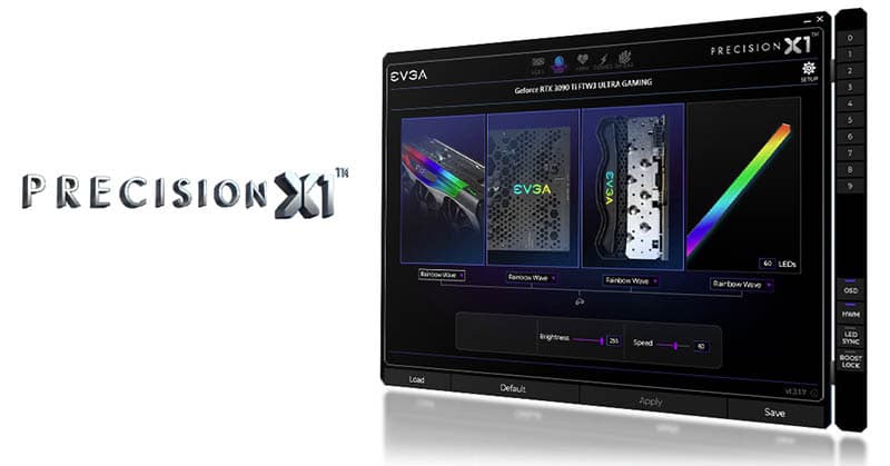 Las EVGA RTX 3090 Ti son compatibles con el software EVGA Precision X1, el cual no solo permite obtener control completo sobre las frecuencias, límites de poder, voltajes, y velocidades de fans de la tarjeta, ajustándola al punto de rendimiento y consumo buscado, sino que también permite monitorear en tiempo real los 9 sensores de temperatura y los puntos de medición de consumo de la tarjeta gráfica, y configurar sus cuatro zonas de iluminación RGB personalizable para asegurar que su iluminación esté en sintonía con la del resto de tu sistema.