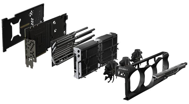 Las RTX 3090 Ti FTW3 de EVGA vienen equipadas con el nuevo sistema de refrigeración de la compañía, que incluye una cámara de vapor encargada de extraer el calor de la GPU y transmitirlo a los heatpipes que lo distribuyen a lo largo de su disipador de 3.5 slots. Luego, este calor es retirado con la ayuda de los tres fans HDB 2.0 con diseño asimétrico que incluye este innovador sistema, manteniendo la tarjeta gráfica lo más fresca posible.