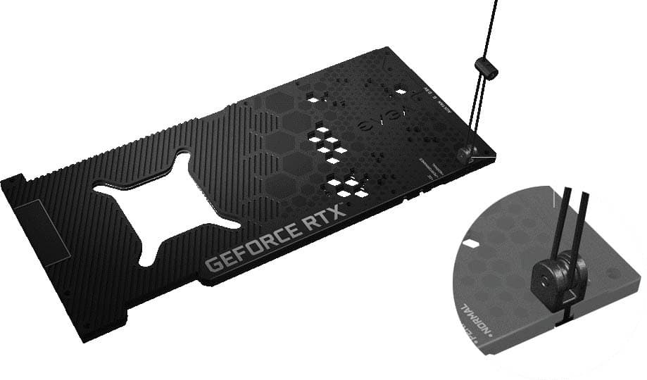 Por si todo esto no era suficiente, las RTX 3090 Ti FTW3 también incluyen un backplate de cobertura completa fundido a presión, el cual no solo refuerza su PCB para ayudar a sostener el peso de su gran disipador, sino que además cuenta con un heatpipe ultra-delgado para ayudar a remover el calor de los componentes de la parte trasera, y es compatible con el nuevo sistema eLeash de EVGA, el cual permite sostener la tarjeta gráfica de forma recta, evitando curvaturas del PCB que la puedan dañar a largo plazo.