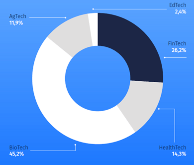 Los principales verticales invertidos en este segmento son: BioTech (45,2%), FinTech (26,2%), HealthTech (14,3%) y AgTech (11,9%).