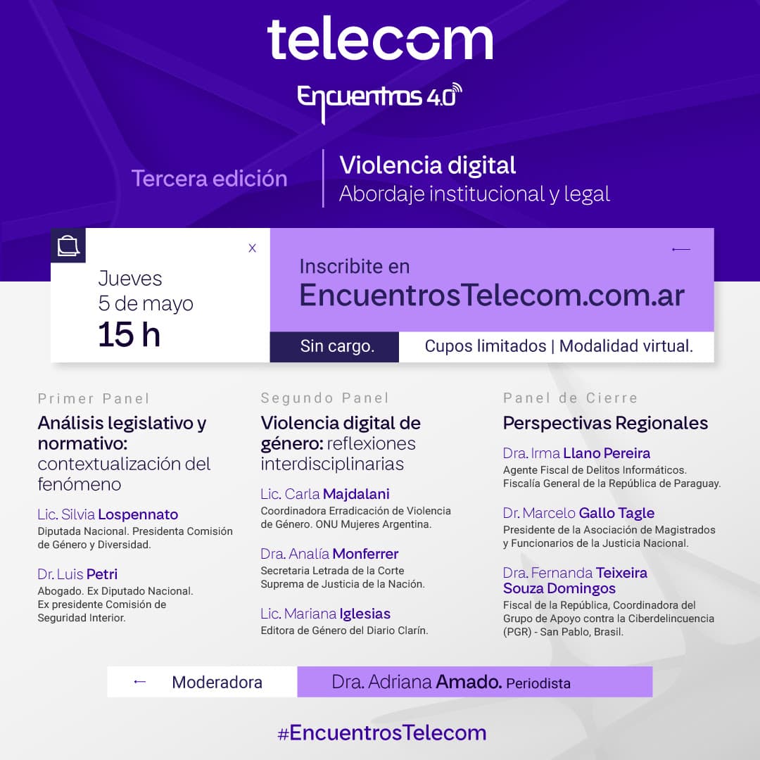 Con la conducción de Adriana Amado, en esta oportunidad el ciclo contará con la presencia de importantes personalidades del ecosistema legislativo: Silvia Lospenatto y Luis Petri aportarán el estado de situación de las iniciativas legislativas; Carla Majdalani, Analía Montferrer y Mariana Iglesias compartirán los desafíos que existen en el tratamiento de la violencia digital de género; mientras que Fernanda Teixeira Sousa Domingos (Brasil), Irma Llano Pereira (Paraguay) y Marcelo Gallo Tagle ofrecerán una perspectiva regional sobre este escenario de delito digital.