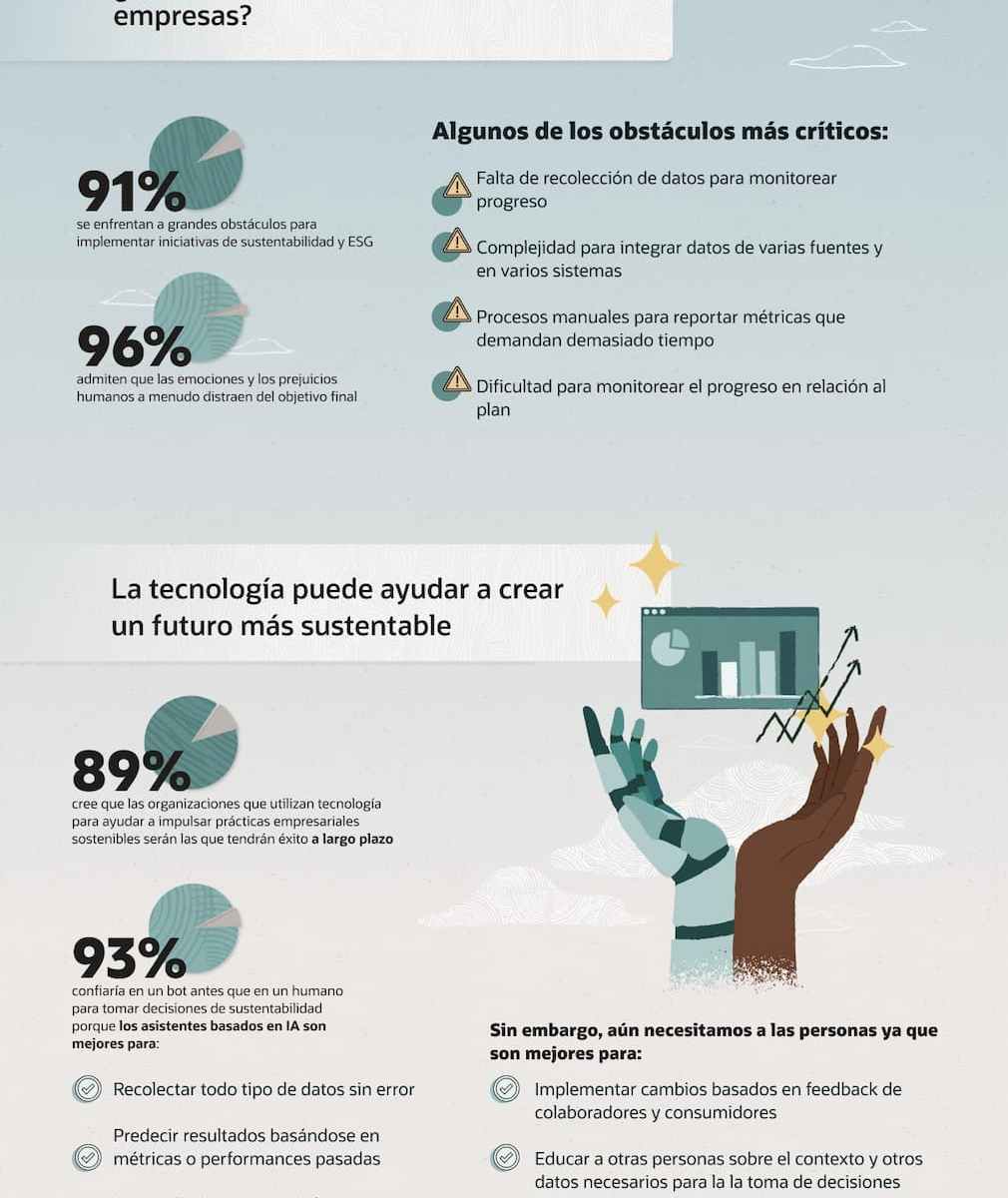 - El 96 % de los líderes empresariales admiten que las emociones y los prejuicios humanos a menudo distraen del objetivo final y un 89 % cree que las organizaciones que utilizan la tecnología para ayudar a impulsar prácticas empresariales sostenibles serán las que tendrán éxito a largo plazo.