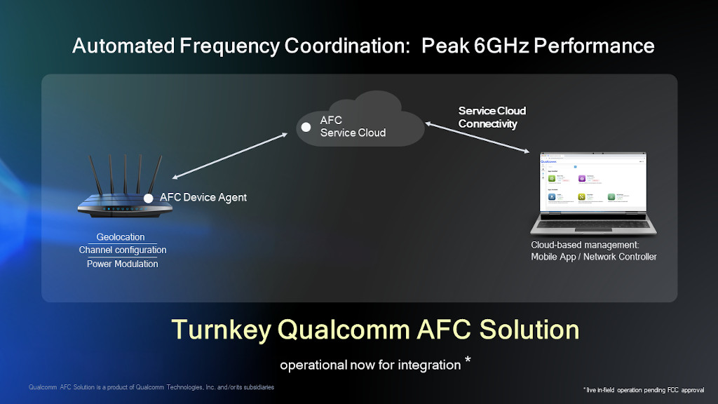 - Para maximizar el funcionamiento en 6 GHz, incluyendo el largo alcance y los exteriores, el servicio Qualcomm AFC es una solución llave en mano para el hardware y el software. La solución Qualcomm AFC ya está disponible para la integración de dispositivos de clientes en las plataformas Qualcomm Networking Pro Series y Qualcomm® Immersive Home. Una vez que se concedan las aprobaciones reglamentarias, la solución Qualcomm AFC estará disponible comercialmente para su uso por el público.