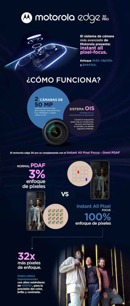 Pero lo más interesante es que el motorola edge 30 pro se complementa con una tecnología nueva para la industria: Instant All Pixel Focus – Omni PDAF, que usa todos los píxeles para un enfoque más rápido. Veamos como: