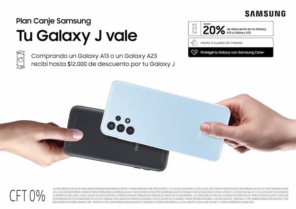 A partir del 1 de Julio del 2022, la serie de smartphones “Galaxy J” tendrá un beneficio único y exclusivo de Samsung conocido como Plan Canje. El mismo permitirá entregar un smartphone usado como parte del pago para poder adquirir uno nuevo de la marca (Fuente Samsung Argentina).