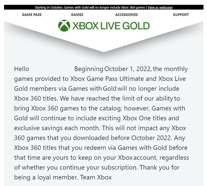 Ademas en el correo agrega que los usuarios de Xbox pueden volver a descargar cualquier título de 360 que reclamaron a través de Games with Gold, independientemente de si continúan suscritos a Xbox Live Gold.