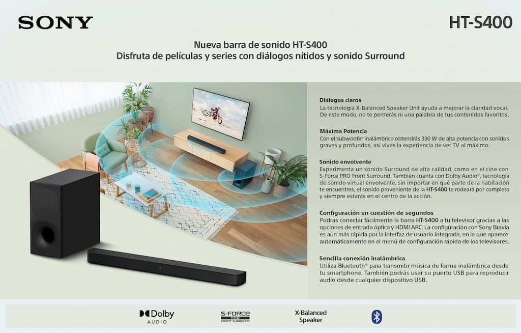 Sony presenta la barra de sonido HT-S400 de 2.1 canales, llevando el sonido envolvente de las salas de cine a la sala de casa. Cuando se usa para ver la última película, reproducir tu serie favorita, o escuchar música, la HT-S400 proporciona una poderosa experiencia auditiva gracias a su tecnología S-Force PRO Front Surround, con diálogos cristalinos y una potencia de salida total de 330W (Fuente Sony Argentina).