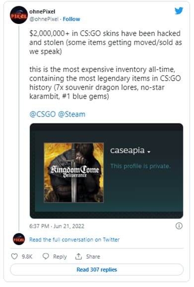 El pasado 21 de junio, un usuario de Twitter –bajo el nombre de ohnePixel – reportó que se habían robado más dos millones de dólares en skins de CS:GO de una cuenta pirateada. Entre los objetos robados se incluyen una variedad objetos “raros” como Souvenir AWP Dragon Lore, la skin más cara de CS:GO, que puede alcanzar cientos de miles de dólares (Fuente Kaspersky Latam).