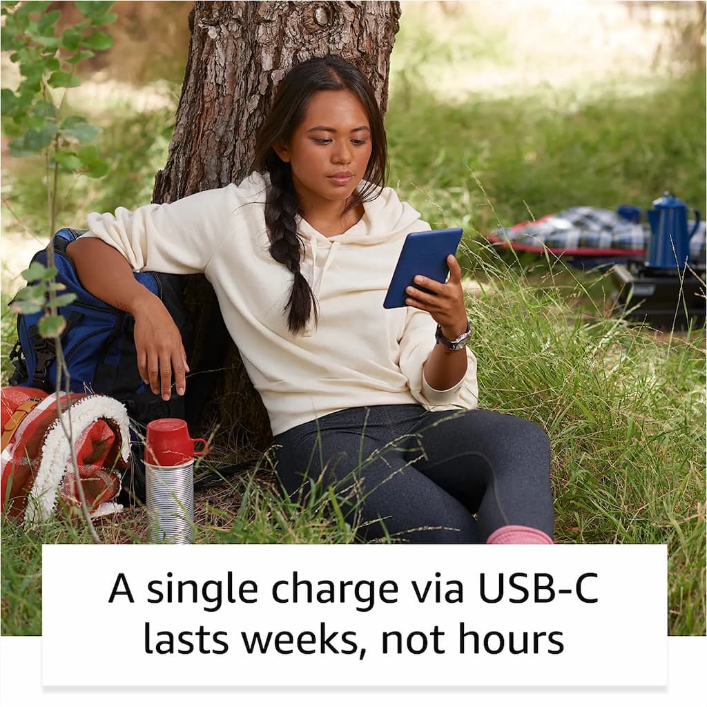 El nuevo Kindle cuenta con carga USB-C combinada con almacenamiento de 16GB, siendo el doble del almacenamiento de su predecesor. También ofrece una pantalla sin reflejos, junto con una luz frontal ajustable que permite una experiencia de lectura cómoda, independientemente de si se encuentra en el interior de una habitación oscura o al aire libre bajo la luz solar directa.