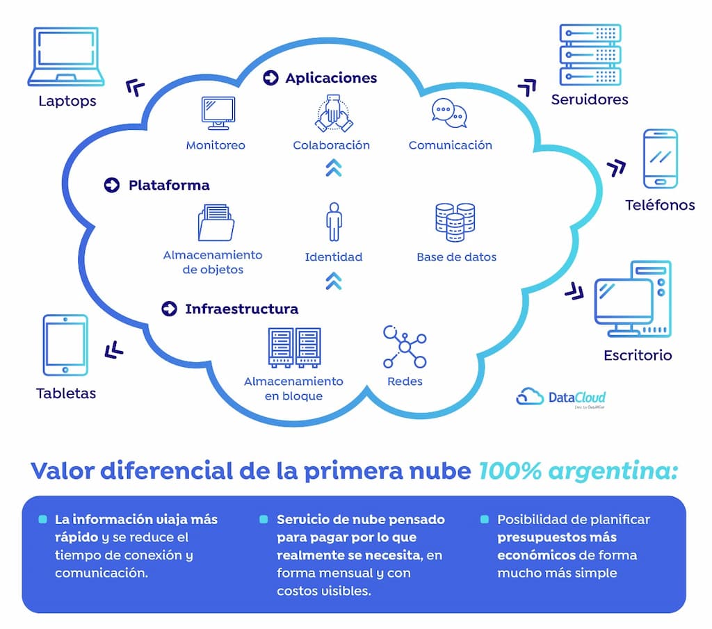 Hablar de la nube es hablar de internet en su capacidad de almacenamiento, distribución y consumo. Podemos conectarnos a la nube y tomar los recursos que necesitamos, en la forma y el momento oportuno. Cuando hablamos de este servicio pensamos en grandes empresas internacionales como las principales proveedoras de la “solución Cloud”; pero Argentina tiene, desde 2018, su propia compañía dedicada a brindar este servicio totalmente local: DataCloud.