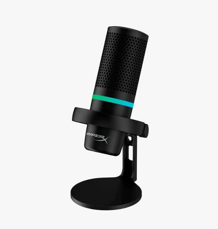 El micrófono USB HyperX DuoCast está diseñado para satisfacer las demandas de los streamers profesionales o aspirantes a PC, PS5TM, PS4TM y Mac.  El DuoCast utiliza una profundidad de bits de 24 bits de alta resolución y una frecuencia de muestreo de hasta 96 kHz para proporcionar una captura de voz nítida y de alta calidad. El micrófono también utiliza un filtro pop interno para proporcionar una captura de audio más limpia. El DuoCast cuenta con un montaje de choque/shock moutn de bajo perfil, un ajuste de control de ganancia de fácil acceso, dos patrones polares seleccionables (cardioide y omnidireccional) y funcionalidad de toque para silenciar/mute con iluminación LED conveniente para indicar el estado de la transmisión. DuoCast también ofrece ccccc que se puede personalizar a través del software HyperX NGENUITY.