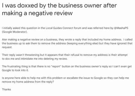 Hay multiples casos de personas han sido víctima de doxing. Por ejemplo, luego de dejar una mala puntuación a un negocio, también una mujer fue identificada por la matrícula de su coche en un video que alguien subió en el cual la filmaron en un momento de rabia, y en otro caso el número de teléfono de una mujer fue publicado en Craigslist en un anuncio de sexo falso como venganza por su opinión profesional publicada en un periódico local.