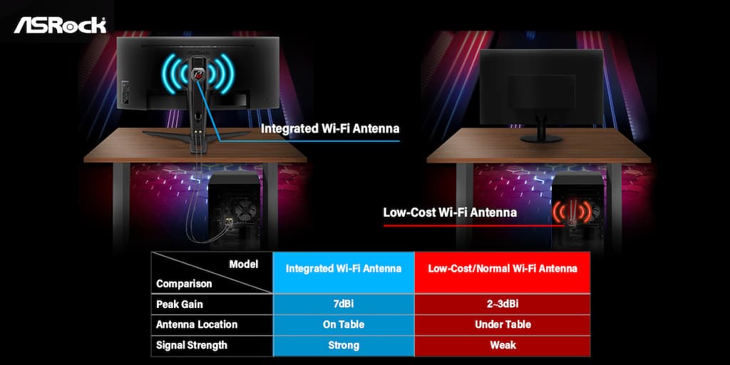 El Phantom Gaming PG34WQ15R2B es el primer monitor del mundo que trae antenas Wi-Fi integradas. Al conectar las antenas a la PC, la señal inalámbrica no será obstaculizada por el escritorio. Además, las antenas de ASRock ofrecen una ganancia pico de 7 dBi que mejora la conexión y ayuda a los gamers a disfrutar de juegos fluidos y sin problemas de latencia.