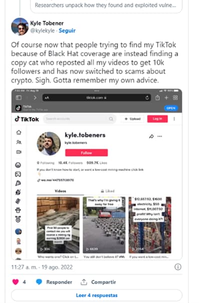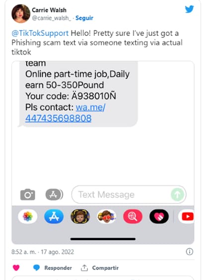 - Cuentas de bots en TikTok: Todavía existen muchas cuentas de TikTok que son bots programados para interactuar con usuarios específicos y con la intención de hacerles creer que se están comunicando con una persona real. En última instancia, estos bots pueden pedir a las víctimas información confidencial o incluso sugerir que las víctimas sean redirigidas a un sitio que, de hecho, es un sitio fraudulento que intenta robarles información o instalar malware en sus teléfonos.