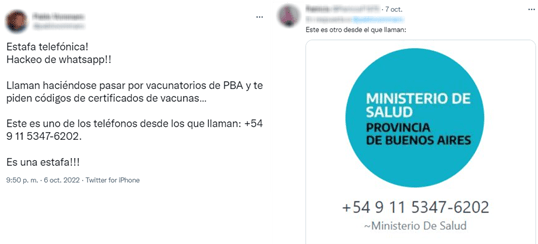 Desde ESET se alertó a los usuarios en 2021 sobre esta forma de actuar los delincuentes, dado que estaban al tanto de casos en los que se estaban haciendo pasar por el Gobierno de la Ciudad de Buenos Aires en Argentina. En los últimos meses, el equipo de investigación observó varias denuncias donde las personas alertan que son contactados por un teléfono con la imagen del Ministerio de Salud de la Provincia de Buenos Aires.