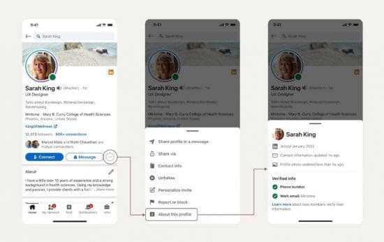 La primera de las nuevas funciones se llama “About this profile” y permite obtener más información de una cuenta. Por ejemplo, fecha de creación de un perfil, fecha de la última actualización, si el número de teléfono está verificado o si el correo asociada a una cuenta de LinkedIn es de una empresa.