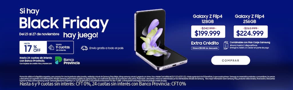 Con la llegada de una nueva edición de Black Friday, Samsung presenta descuentos que se suman a los beneficios ya conocidos de la marca en el país, como Plan Canje, cuotas sin interés y envío gratis (Fuente Samsung Argentina).