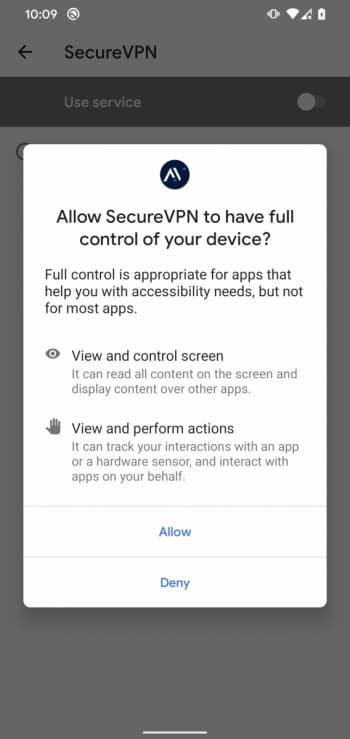 Solicitud falsa de SecureVPN para habilitar manualmente los servicios de accesibilidad.
